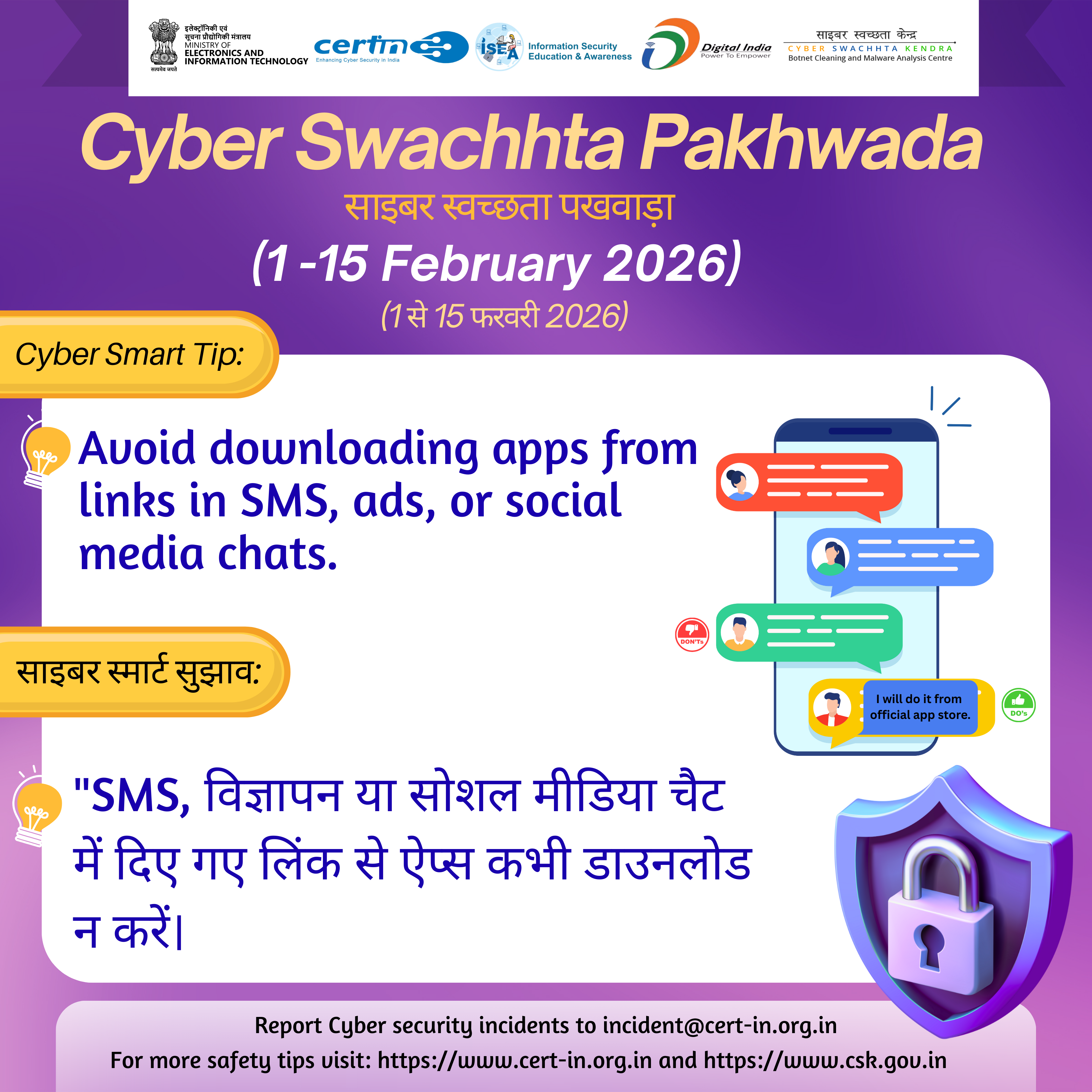 सीईआरटी-इन, 01 - 15 फरवरी 2026 के दौरान नागरिकों के बीच साइबर स्वच्छता के बारे में जागरूकता पैदा करने के लिए "साइबर स्वच्छता पखवाड़ा" मना रहा है।